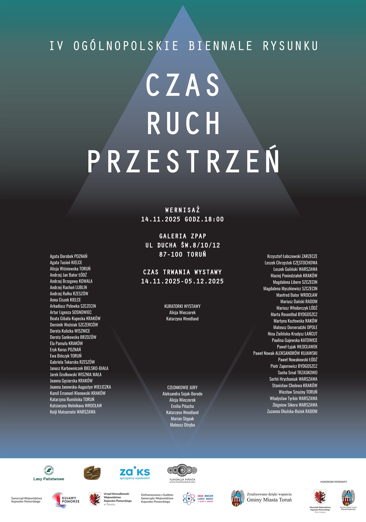 Zapraszamy na wystawę pokonkursową IV Ogólnopolskiego Biennale Rysunku CZAS-RUCH-PRZESTRZEŃ. Podczas wernisażu 14 listopada 2025 o godz. 18:00 poznamy laureatów nagród i wyróżnień. Wystawę można będzie oglądać do 5 grudnia w Galerii ZPAP przy ul. Ducha Św. 8/10/12 w Toruniu.